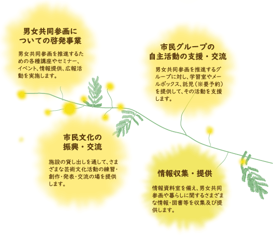ホールや研修室などの施設の貸し出しによって市民文化の振興・交流に貢献するとともに、男女共同参画社会の実現を目指すための講座やセミナー、イベントなどを行っています。また、市民グループの活動の支援や、情報資料室を中心に主に男女共同参画に関する情報の収集・提供など、さまざまな機能を持つ複合施設として自立と調和のある市民社会の実現に力を注いでいます。