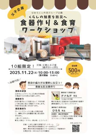 はあもにい市民グループ企画 防災についてのお話、災害時に役立つ食器づくり、ローリングストックとして使える食材を使い、簡単に作れる栄養価の高い防災食を作ります。 日時:11月22日(土曜日) 10:00...