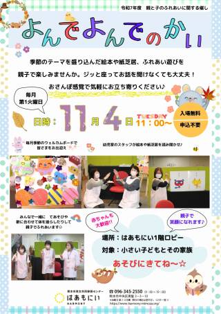 R7年 11/4(火) よんでよんでのかい 「よんでよんでのかい」では、季節のテーマに合わせて絵本の読み聞かせや 紙芝居、手遊び歌など、お子さまとご家族が楽しみながら触れ合える時間を ご用意しておりま...