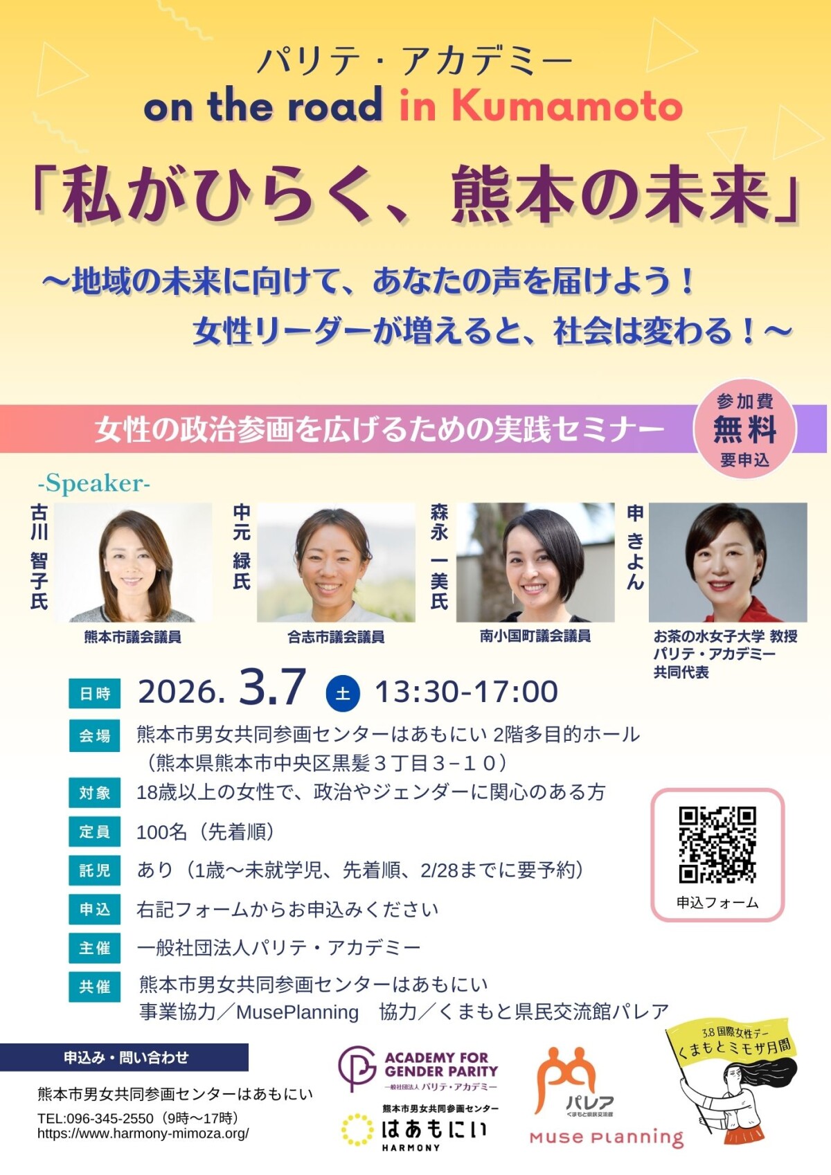 登壇者:古川智子氏(熊本市議会議員)、中元緑氏(合志市議会議員)、森永一美氏(南小国町議会議員)、 申きよん氏(お茶の水女子大学教授 パリテ・アカデミー共同代表)
