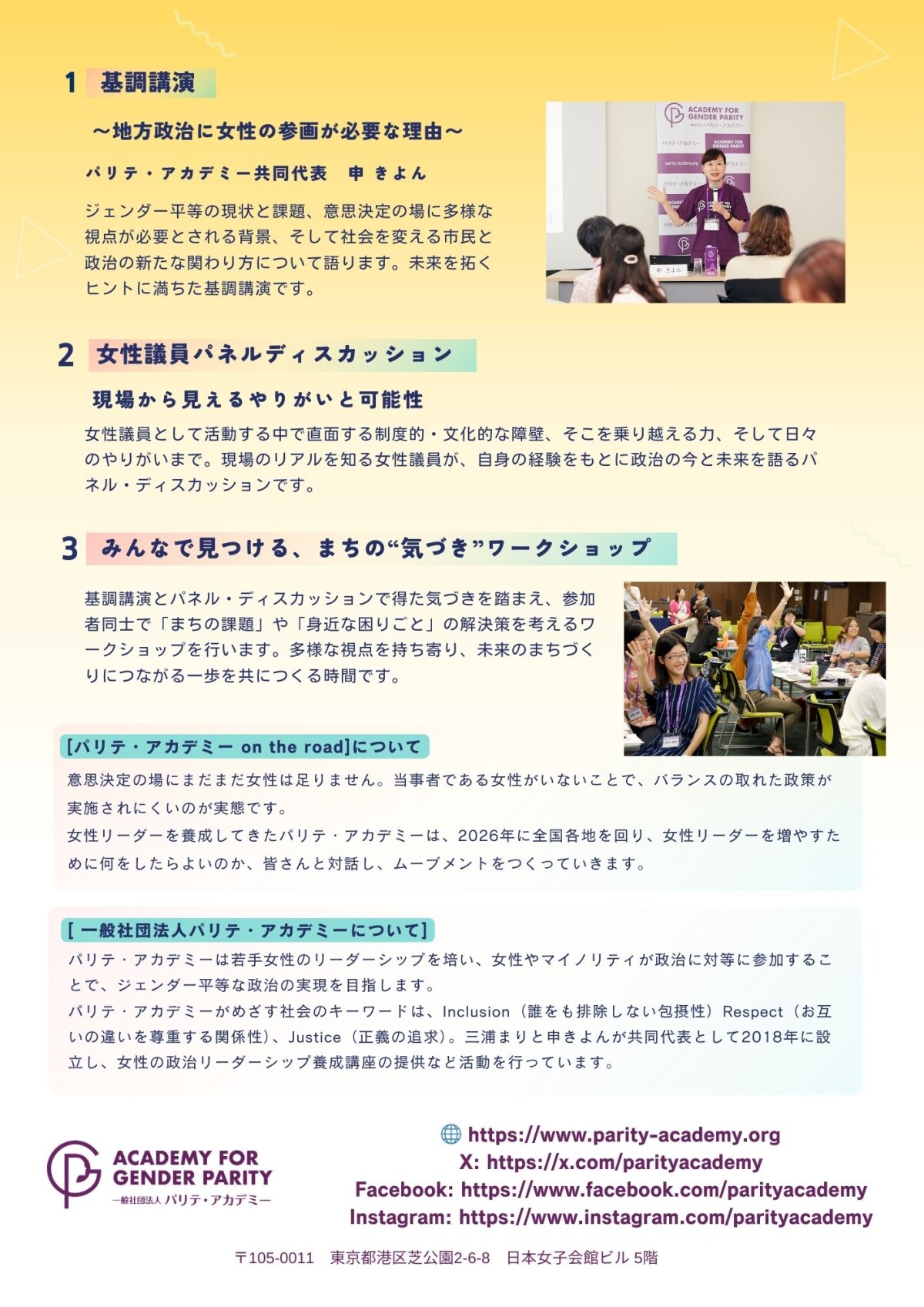 内容:①基調講演~女性議員はなぜ必要なのか 未来へのヒントを考える~