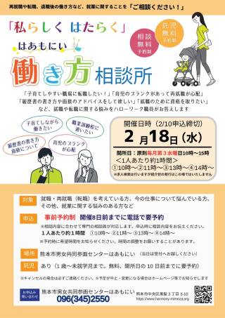 仕事の不安や働き方の不安など、「働くこと」に関する無料相談会を毎月第3水曜日に実施します。 相談は予約制で一人約1時間。 ハローワークの相談員に、就職に関するさまざまな悩みを相談しませんか。子どもさん...