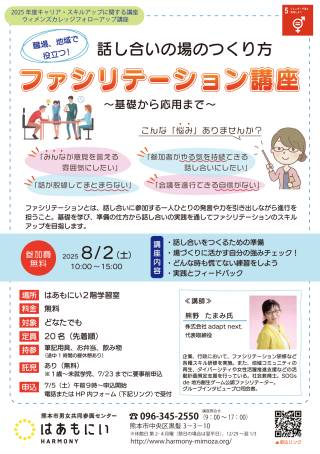 キャリア・スキルアップに関する講座話し合いの場のつくり方 ファシリテーション講座 ~基礎から応用まで~ ※キャンセル待ち・電話のみの受付です。Tel:096-345-2550(9時~17時) ファシリ...