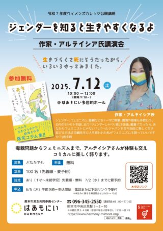 毒親問題からフェミニズムまで、アルテイシアさんが体験も交えコミカルに楽しく語ります。 【日時】2025年7月12日(土) 10:00~正午(開場9:30) 【会場】はあもにい2階多目的ホール 【講師】...