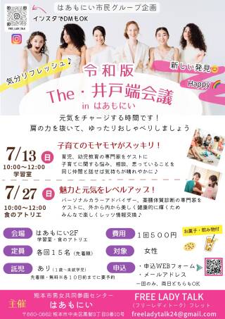 2025/7/13日、27日 10:00~12:00 市民グループ支援 【終了】令和版 The・井戸端会議 はあもにい市民グループ企画 <令和版 The・井戸端会議> 「子育て」「美容・健康」など、身近なテーマで参加者の皆さんがゆったり、楽しく語り合える場所です。1回目「子育て」では、育児・幼児教育の専門... 2025年7月27日