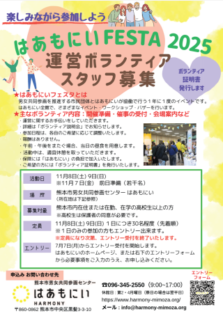 はあもにいフェスタ2025 運営ボランティアスタッフ募集 お知らせ 『はあもにいフェスタ』とは、男女共同参画を推進する市民団体とはあもにいが協働で行う1年に1度のイベントです。 はあもにい全館でさまざまなイベント・ワークショップ・バザーなどを行います。 運営ボランティ... 2025年9月1日