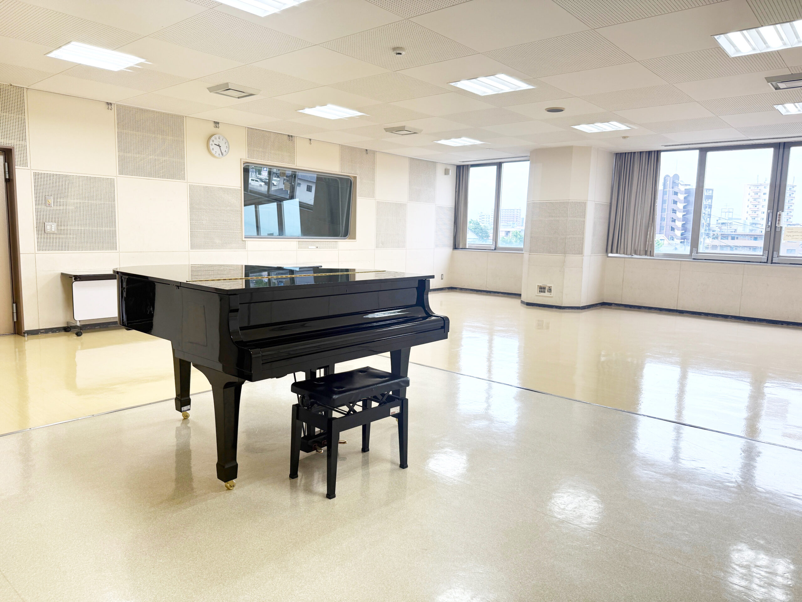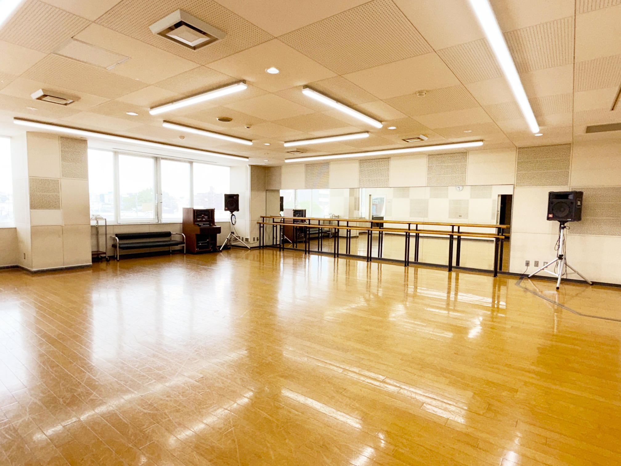 大きな鏡のある板床の部屋。ダンスや演劇の練習に最適です。シャワー室もあります。